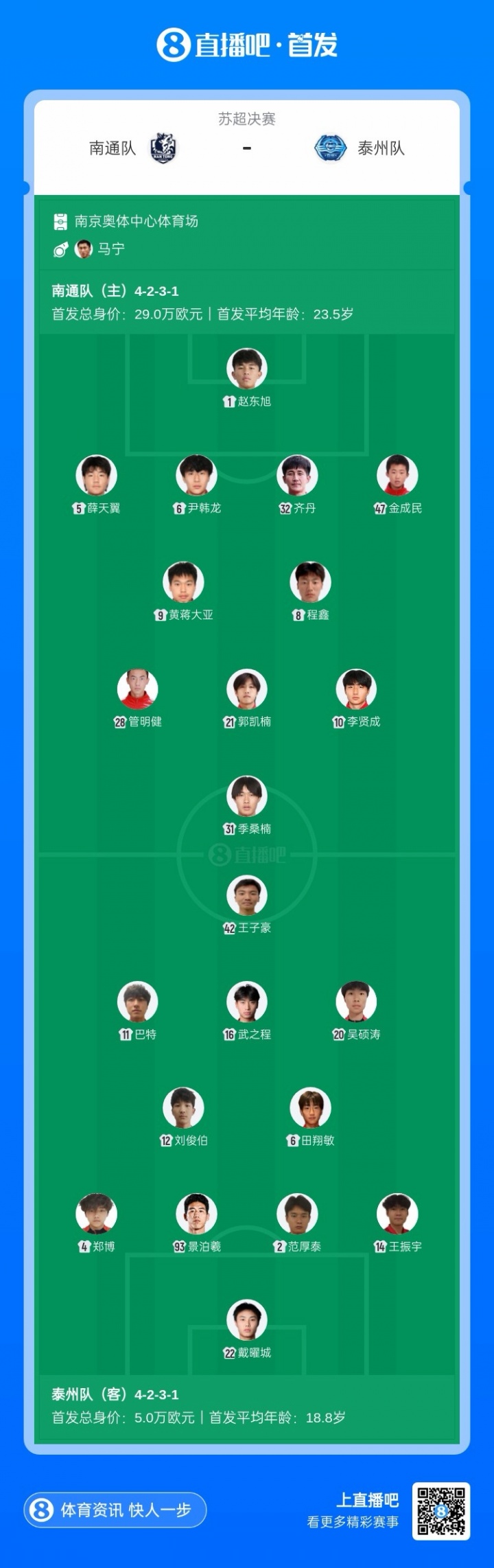 泰州队首发:22-戴曜城、2-范厚泰、4-郑博、14-王振宇、20-吴硕涛、93-景泊羲、6-田翔敏、12-刘俊伯、16-武之程、42-王子豪、11-巴特